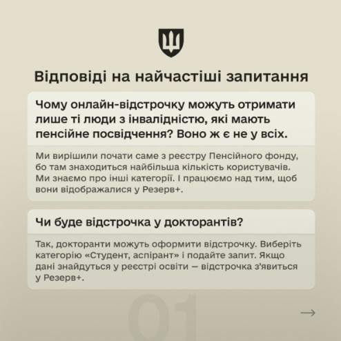 На сьогодні отримати онлайн право на відстрочку можуть громадяни, що мають дійсне пенсійне посвідчення за інвалідністю. А також студенти аспіранти і докторанти, які навчаються послідовно, переходячи з бакалаврату на магістратуру чи з магістратури на аспірантуру. Для них відстрочка діятиме до закінчення воєнного стану та мобілізації.