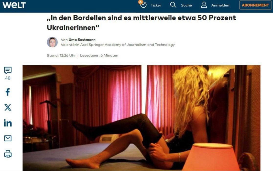 Контекст: після початку війни в Україні кількість наших громадянок у сфері секс-послуг у країнах ЄС суттєво зросла. Більшість із них вважають це вимушеним кроком через економічні труднощі та відсутність стабільної роботи.