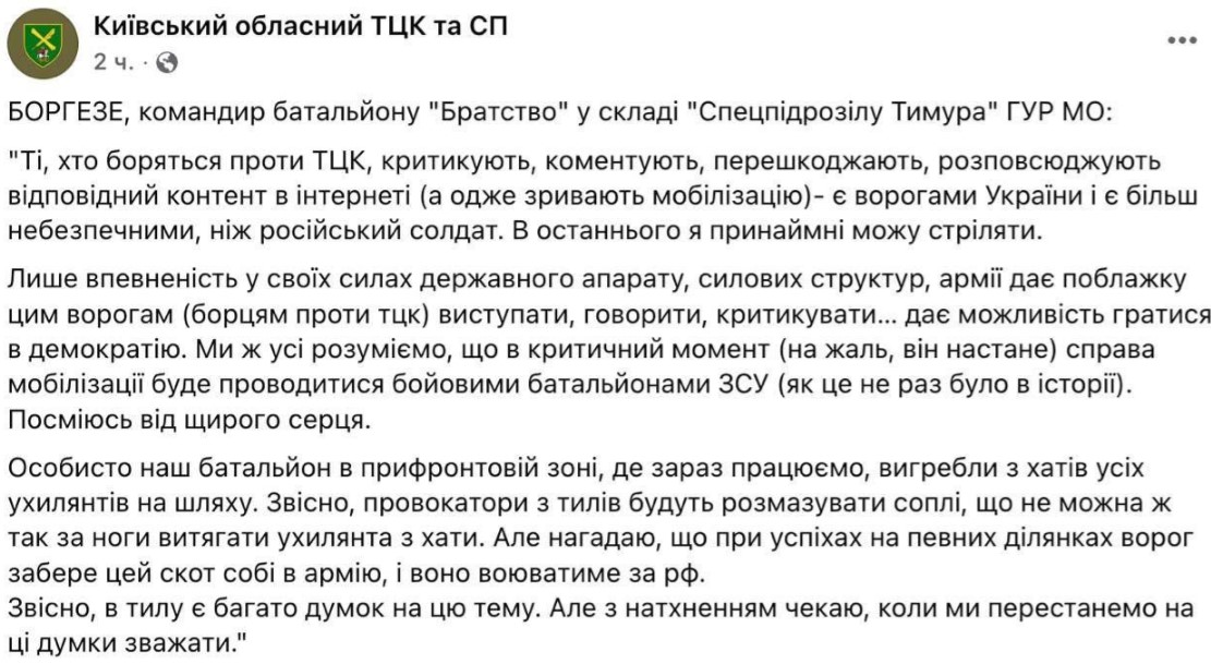 У мережі поширилися заяви, які приписують представникам військових структур щодо жорсткіших дій під час мобілізації. Йдеться про висловлювання командира підрозділу батальйон «Братство», відомого за позивним «Боргезе», який повідомив про примусове затримання осіб, що ухиляються від мобілізації, у прифронтових районах.